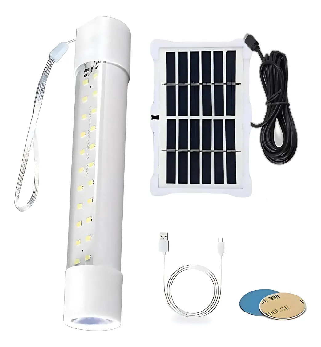 Contenido: 1 lampara recargable solar y corriente, 1 panel solar, 1 cable usb
