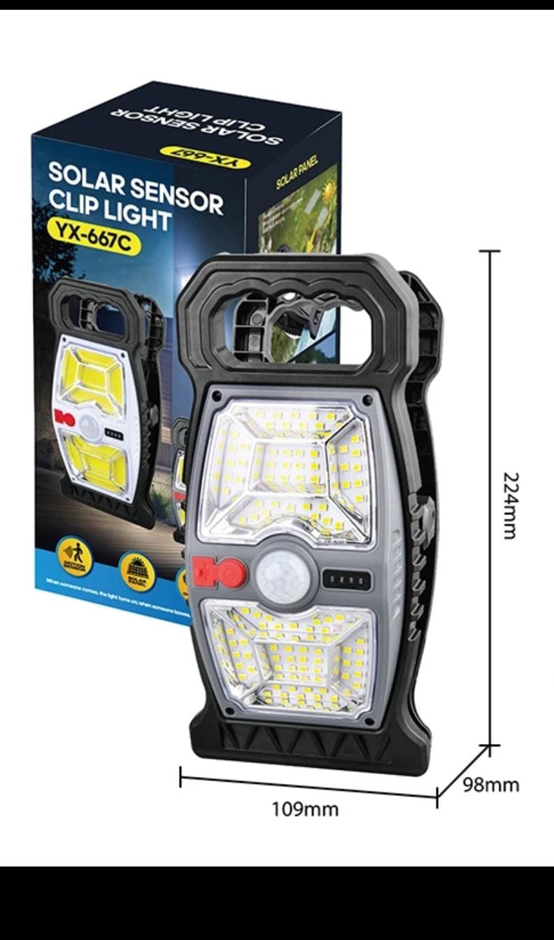 La Solar Sensor Clip Light YX-667C es una lámpara multifuncional diseñada para brindar iluminación potente, práctica y ecológica en cualquier espacio. Equipada con tecnología LED de alta intensidad y un panel solar integrado, esta lámpara garantiza eficiencia energética y larga duración, eliminando la necesidad de baterías desechables o conexión eléctrica constante.
