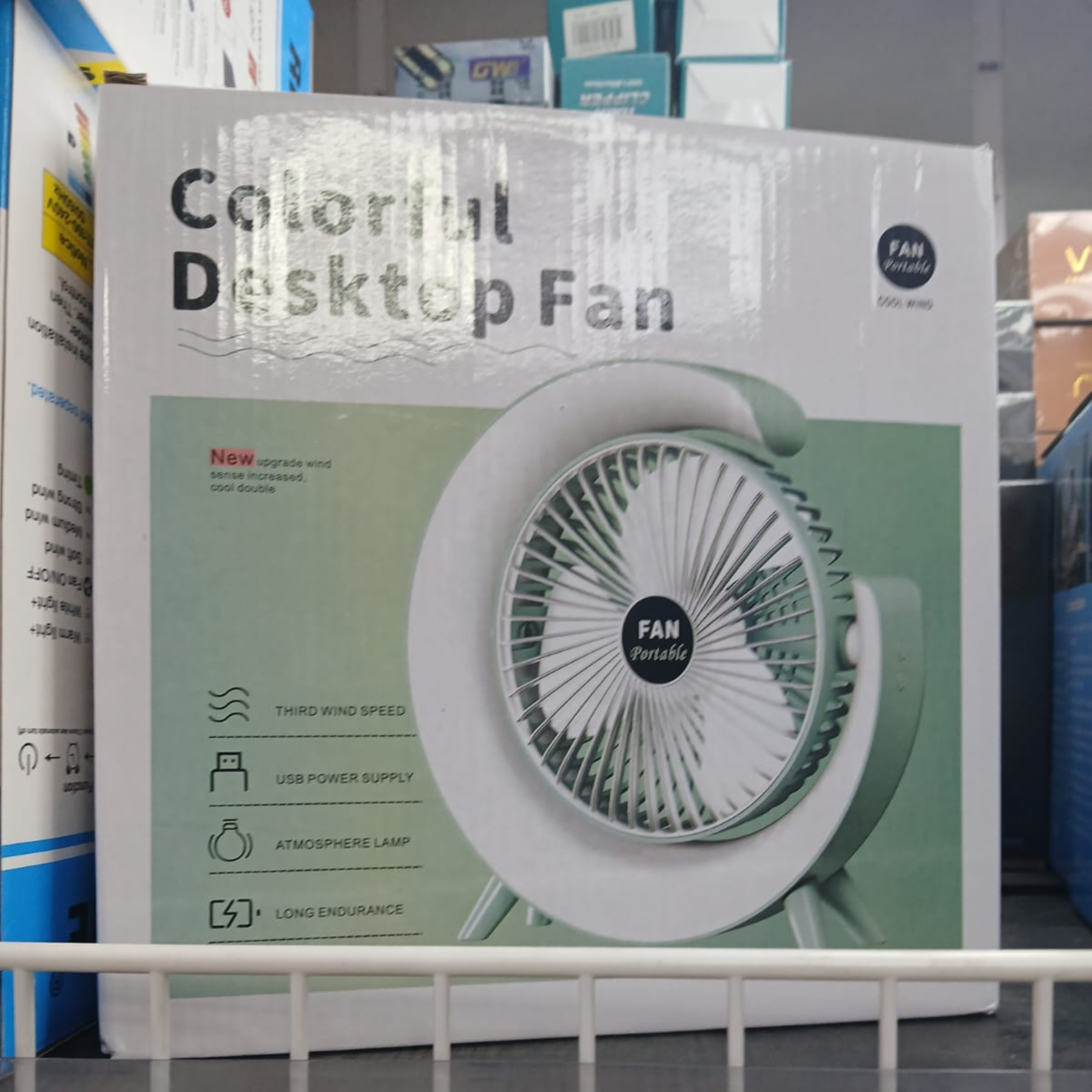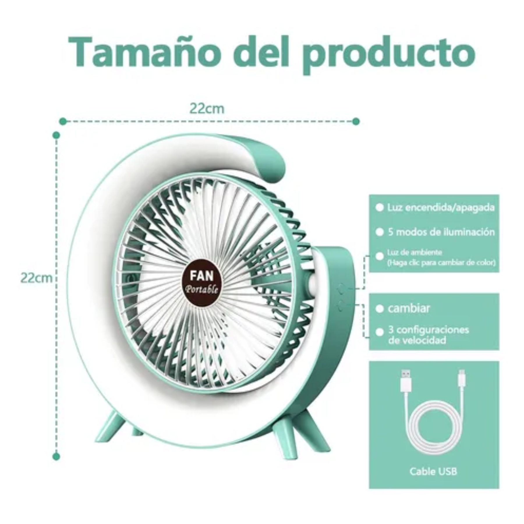El ventilador de escritorio portátil recargable USB con luz es un dispositivo multifuncional que combina ventilación y luminaria en un diseño compacto y práctico. Funciona con batería recargable mediante puerto USB, lo que lo hace ideal para usar en la oficina, el hogar o al aire libre. Ofrece varias velocidades de viento y cuenta con luz integrada, perfecta como lámpara de noche o apoyo en espacios con poca iluminación. Su tamaño portátil permite llevarlo a cualquier lugar, brindando frescura y comodidad en todo momento.